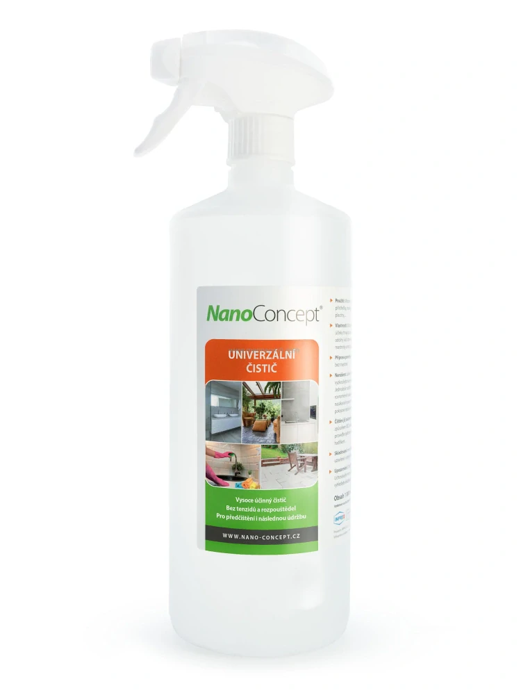 Univerzální Čistič NanoConcept® je vysoce účinný čistič připraven rovnou k použití. Inovativní postup mikrodělení umožňuje účinné čištění bez poškození povrchovými aktivními látkami (tenzidy), rozpouštědly, enzymy a bělícími přípravky.